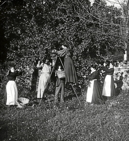 Baserrietan, sagarra funtsezko laborea izan da mendeetan zehar, bai sagardoaren ekoizpenari bai etxeko ekonomiari lotuta. Sagarra udazkenean biltzen da, fruituak heltze-puntu optimoa lortu duenean. Horretarako, kizkia izeneko tresna tradizional bat erabiltzen da: hurritz makila bat, sagarra lurra ukitu gabe askatzeko metalezko kako batekin errematatua. Metodo honek zikintzea saihesten du, eta sagarra babesten. Pedro Cigak ateratako argazkian, bere emazte Dorotea Fernandez Morales agertzen da, Bertizko Jaurerrian sagarrak biltzen, Oieregin. Ikus daitekeenez, eszenaratze antzeztua da, sinesgarritasun gutxikoa, asmo estetiko bati erantzuten diona dokumentalari baino gehiago.