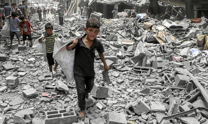 Genozidioak eragindako minak, doluak, beldurrak... neurtu ezinak dira. Gazako Zerrenda suntsiturik dago, horrek esan nahi duen guztiarekin. Oso-oso apurka eta etenaldiekin laguntza humanitarioa sartzen hasi bada ere, Nazio Batuetako Unrwa agentziak salatu du 6.000 kamioi zain daudela mugaren beste aldean, Israelen baimenaren zain. Erreskate taldeak hondakinen artetik gorpuak ateratzen saiatzen ari diren bitartean, hondakin horien artean edo denda baten azpian klaseak ematen ari dira. «Bi urteko genozidioak umeengan eragin dituen traumak sendatzen hasteko, ezinbestekoa dugu hezkuntza sarea berriro osatzea. Nire eskola erasoaldiaren hasieran suntsitu zuten. Denda batean klaseak ematen hasi ginen boluntario talde bat. Egoera gordin horretan, haurren erresilientzia eta ikasteko nahia eredugarriak izan dira. Laguntza sartzen hasi den momentu honetan, liburuak, boligrafoak eta papera beharrezkoak ditugu; gerrari, suntsiketari eta doluari aurre egiten lagun dezaketen baliabideak dira. Berriz idazteko, ikasteko eta amets egiteko aukera eman behar diegu gure haurrei», nabarmendu du Al Jazeera-n argitaratutako iritzi artikulu batean Nada Hamdona irakasle gazatarrak. Bi urte hauetan, 20.000 haur baino gehiago hil eta beste 42.011 zauritu ditu Israelek. Milaka oraindik desagertuta daude. Horien ahotsak ahaztu ez daitezen eta Palestinako herriari babesa eta laguntza adierazteko, gaur Bilbon Gure Haurrak ere Badira Elkartasun Eguna egingo da eguerditik. 17.30ean manifestazioa abiatuko da Jesusen Bihotzetik Udaletxeraino; han, Sol Band, Koiuntura arte, Deiedra Rebel Folk eta Smoking Trumpet taldeek kontzertua eskainiko dute. Liburu zein kamiseta salmenta solidarioa ere egongo da.