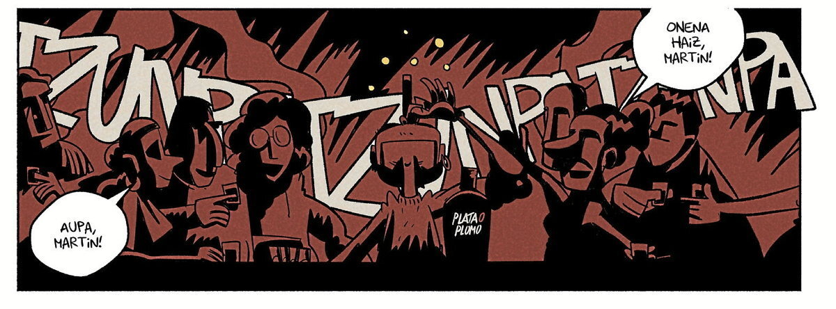 [Beñat] Hortik sortzen da. Azkenean Martinek erabaki batzuk hartu ditu. Justu apustua izan da ez erakustea esplizituki komikian bere bikote harremana eta horren haustura, baina hor dago eta gauza guztiei eragiten die. Komikian zentralitatea laguntasun harremanek hartzen dute. Lagunak dira Martin hortik ateratzen dutenak eta laguntzen diotenak eta momentu batean esaten diotenak “lehen ere hemen geunden eta ez zinen konturatzen”. Aldarri hori nahiko garbi zegoen hasi aurretik eta nik ere garbi nuen hortik eraiki behar genuela.