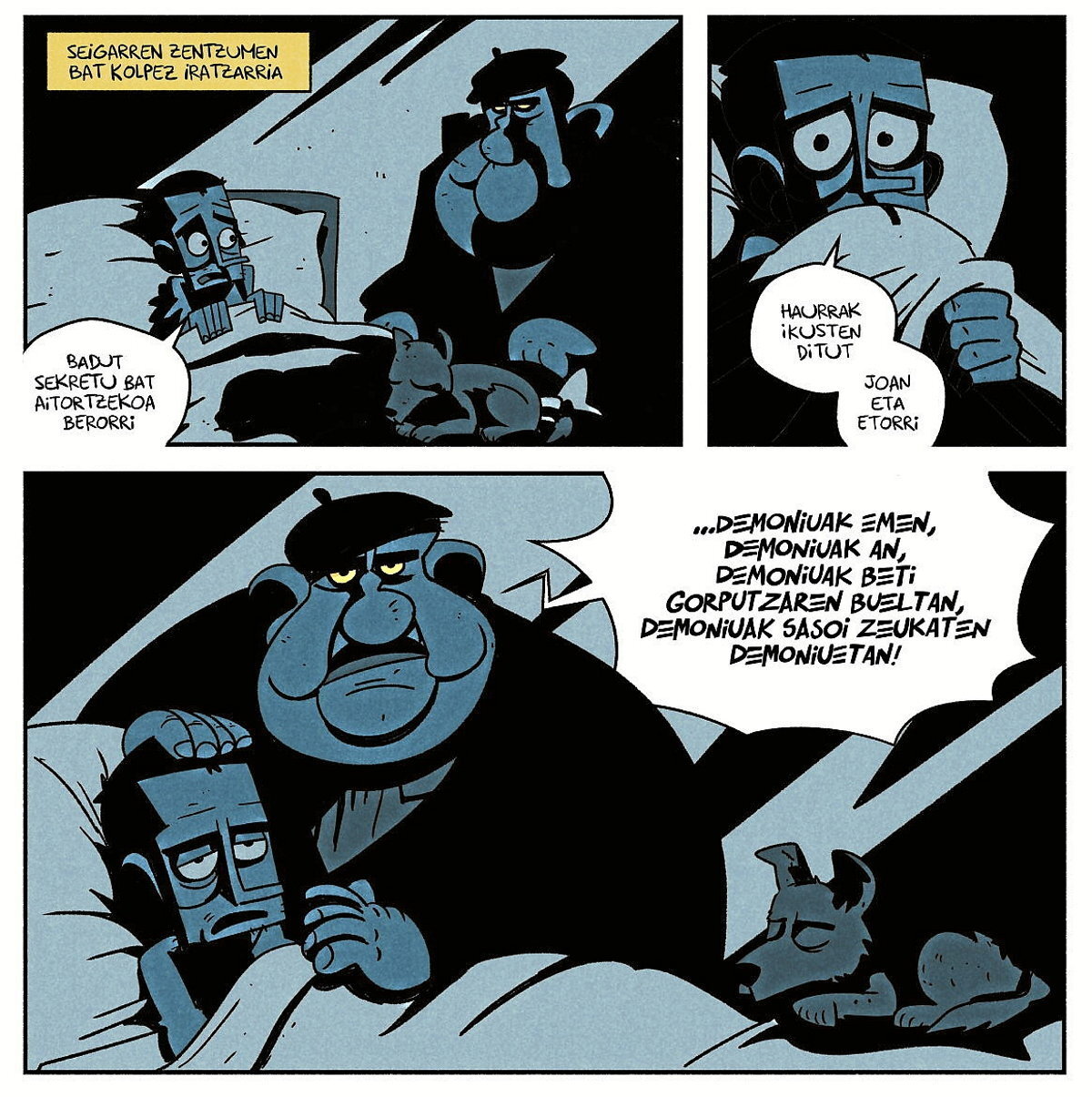 [Beñat] Lehendabiziko komikian kezka neukan, gustura gelditu nintzen gidoiarekin eta komiki bezala erraz irakurtzen zen eta polita zen. Baina niri ez zidan sortzen deserosotasunik. Bigarrena idazten duzunean zuri balioko dizun zerbait idatzi nahi duzu eta, ez bazaitu zu deseroso sentiarazten edo ez bazaitu eramaten muturretara, zertarako balio du egiten ari zarenak? Oraingoan bai izan dut sentsazioa nire mugetara iristen ari nintzela eta horrek azkura pixka bat sortu dezakeela, baina horrela izan behar duela iruditzen zait.