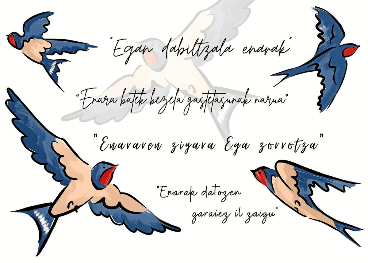 Enaren etorrera, ordea, beti izan da erreferentzia garrantzitsua urteko garai ezberdinek osatzen duten zikloan. Urtero-urtero, enaren lehenbiziko kantuek esaten digute udaberria bertan dagoela. Hasi dela lurra pizten, eta, hala, gizakiak, irribarre batekin hartu izan du enaren etorrera. Amonatik bilobara edo gurasotik seme-alabetara, ainararen ailegatze eguna egun seinalatua izan da. Enara txori bidaiaria baita, hegaldi bihurrikoa, baina hego txikiak astinduz, udazkenean atera eta Euskal Herritik Boli Kosta ingurura migratzeko gaitasuna duena. Udaberriaren atarian, ordea, itzulerako bidaia egingo du. Eta hor bai, hor zerua behatzen duen gizakiak haien hegaldi alaia ikusiko du hodei artean bueltaka, eta ukuilu edota eraikuntzetako sabaietan habiak egiteko joan-etorria behatu: «Iritsi ditun enarak. Ikusi al dun?».